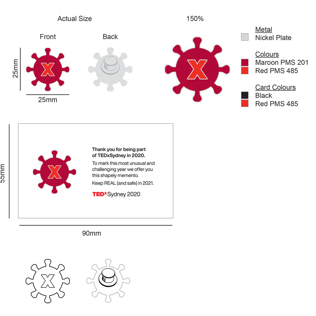 For TEDxSydney 2020, and to mark this most unusual and challenging year TEDxSydney brings you Corona TEDx, a shapely memento to wear on your lapel or keep in your drawer.